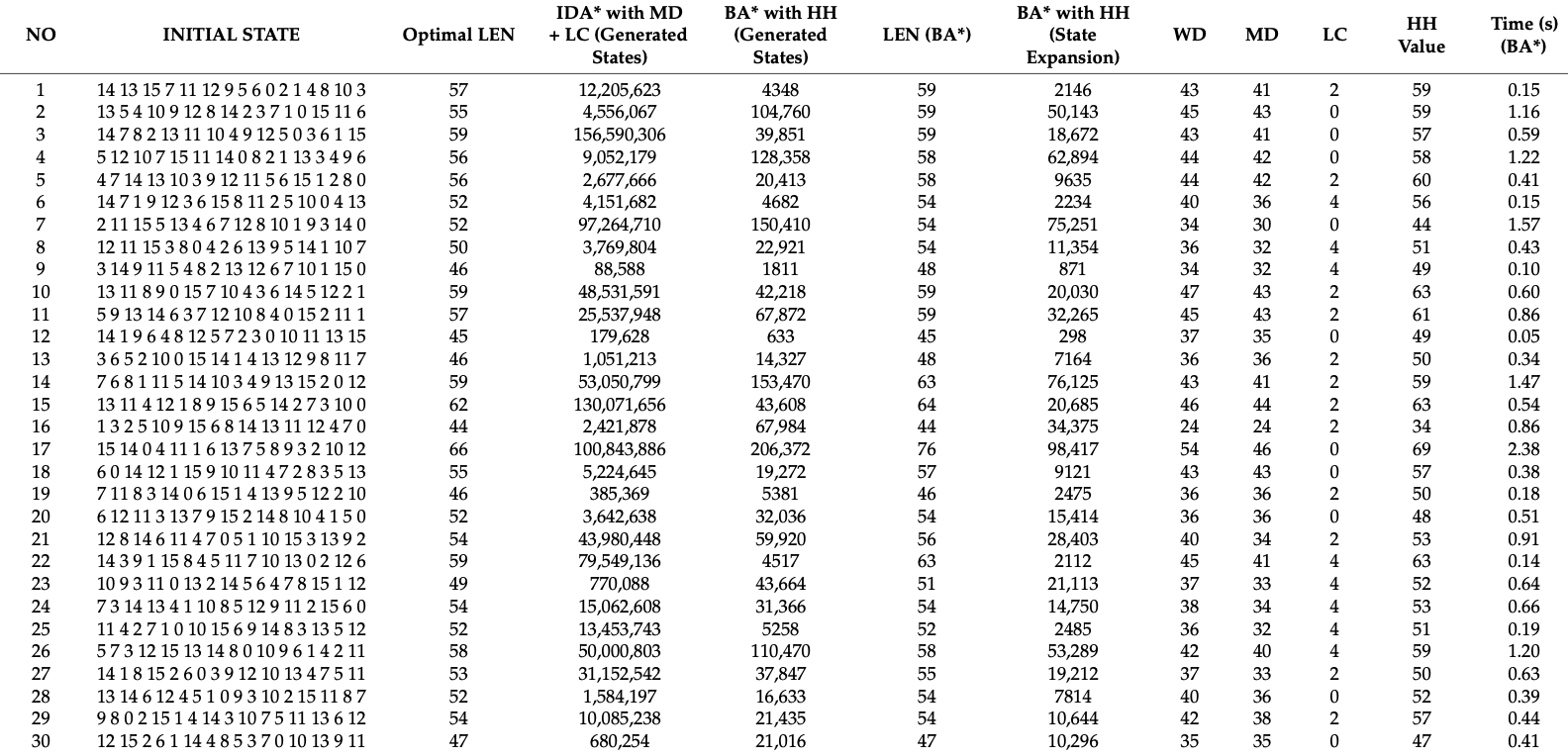 Hasan, D. O., Aladdin, A. M., Hardi, S. T., Tarik, A. R., & Mirjalili, S. (2023). The fifteen Puzzle—A new approach through hybridizing three heuristics methods. Computers, 12(1), 11. URL ↩︎ ↩︎ ↩︎ ↩︎ ↩︎ ↩︎ ↩︎ ↩︎