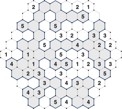 Es wird nach den selben Regeln gespielt, aber das Spielfeld besteht aus Hexagonen. Die Zahlen in den Zellen können entsprechend größer sein. In dem Beispiel aus Abbildung 2[4:1] gibt es auch Zellen mit der Nummer 4 oder 5.