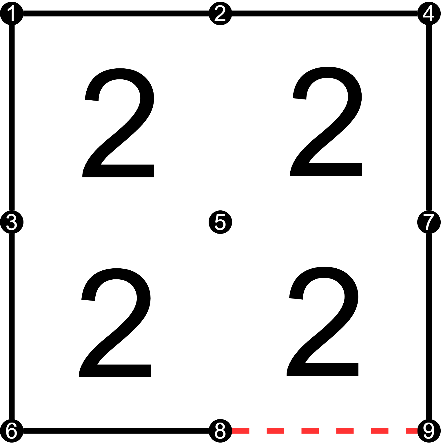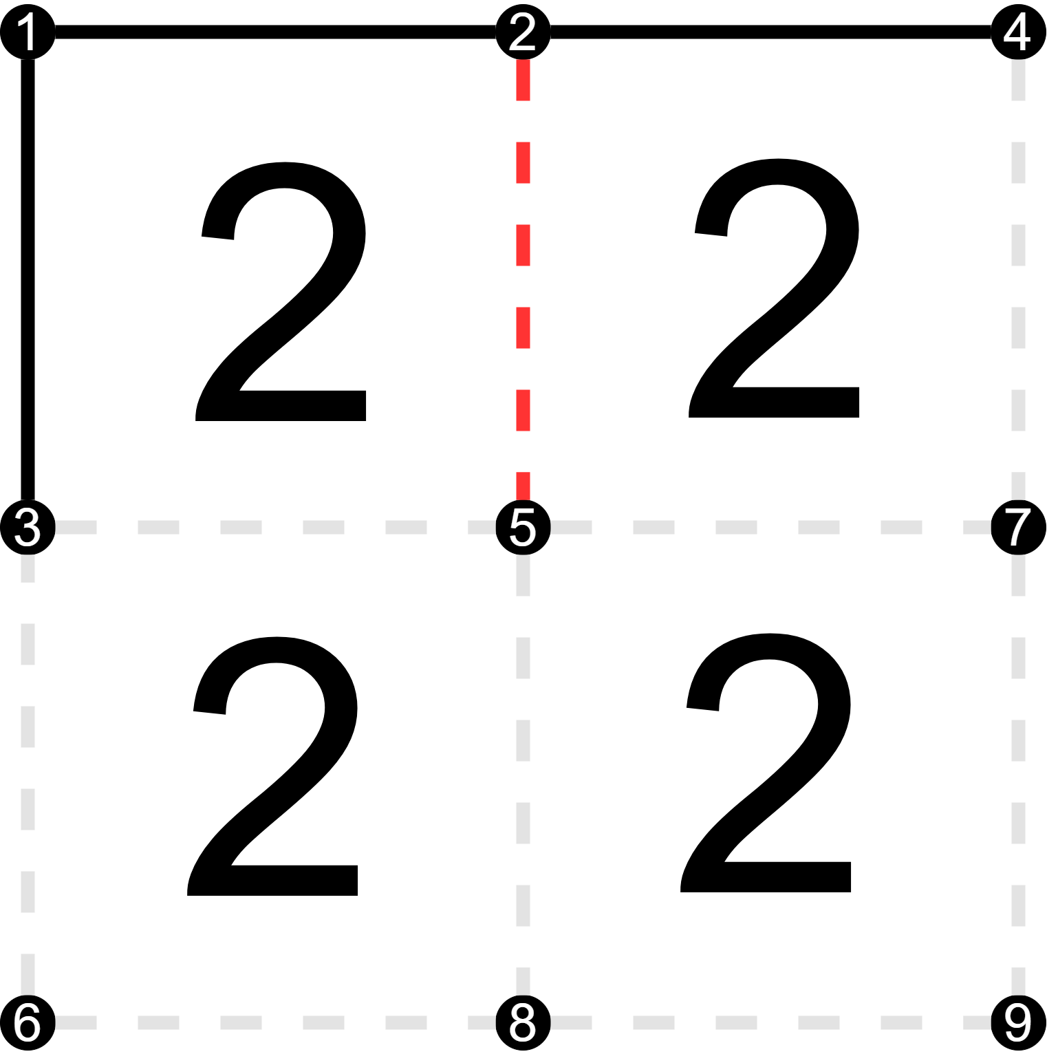 Das einfache Beispiel in Abbildung 12 wird betrachtet und verschiedene Zustände, die bei der Anwendung des Algorithmus auftreten werden, werden untersucht. Die Kantenordnung wird entsprechend der angegebenen Knotennummerierung betrachtet, z.B. . Seien und die Belegung der Funktionen nach der Auswahl einer Kante (1-arc). Für dieses Beispiel gibt es 4 verschiedene Beschränkungen für die umliegenden Linien der Zellen. Sei wie folgt definiert: