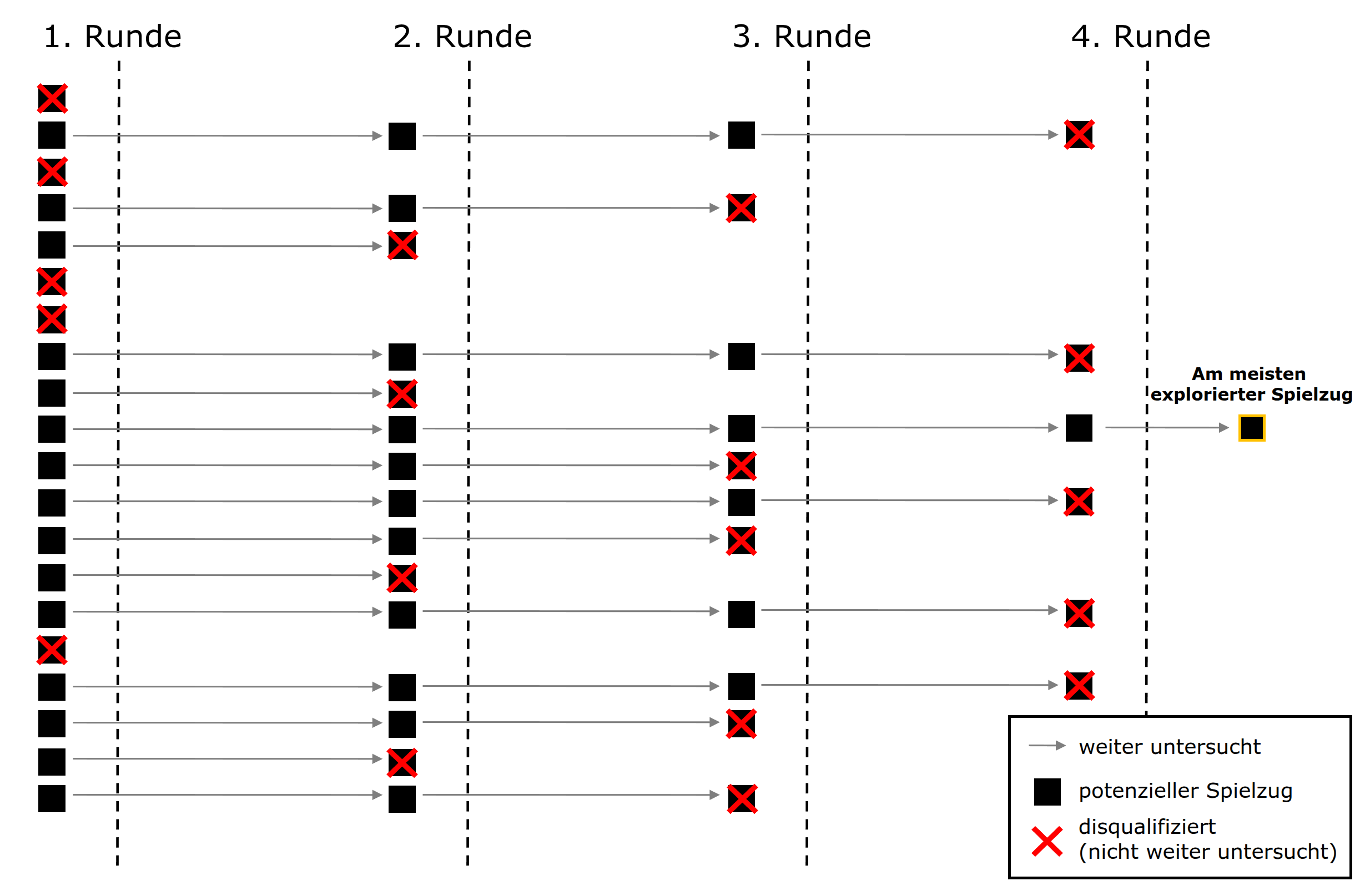 Im ersten Schritt werden mithilfe von Progressive Pruning und der Volatilitätsheuristik Statistiken für alle möglichen Spielzüge generiert: