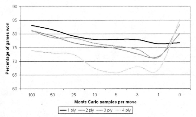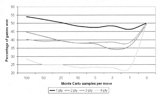 Es wurden je 1000 Partien auf einem 5x5 Brett gespielt. In der Volatile Game Tree Search wurden immer 1 bis 100 Monte Carlo Simulationen mit einer anschließenden Suchtiefe von 1 bis 4 durchgeführt.