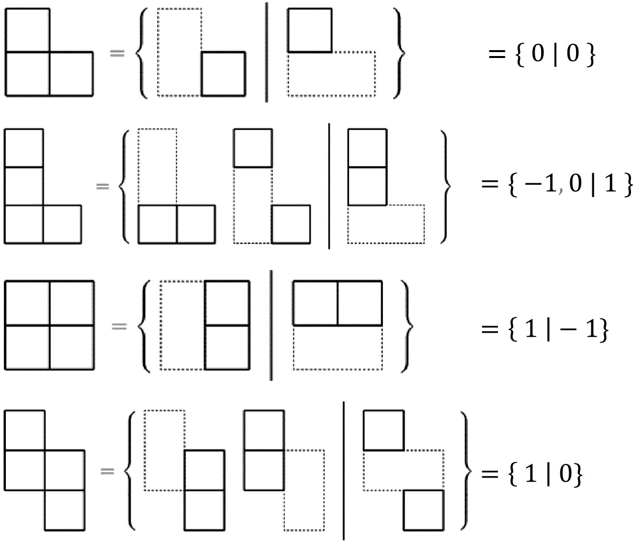 L (Left): die Menge aller möglichen Nachfolgespiele, die Vertikal (bzw. „Left“) durch einen gültigen Zug erreichen kann.R (Right): die Menge aller möglichen Nachfolgespiele, die Horizontal (bzw. „Right“) durch einen gültigen Zug erreichen kann.Hat ein Spieler keine Zugmöglichkeit, bleibt die entsprechende Seite in der surrealen Zahl leer, zum Beispiel