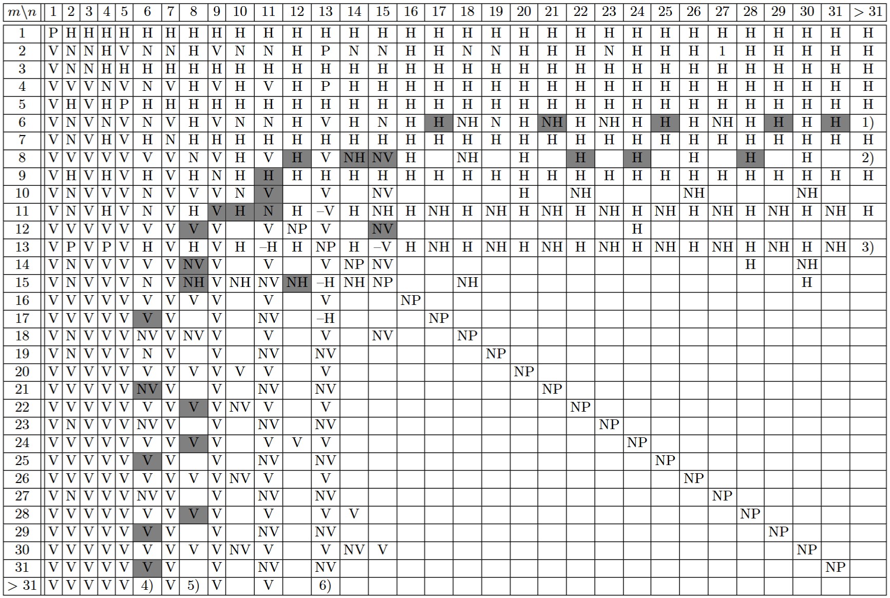 Symbol Bedeutung V Vertikal gewinnt bei perfektem Spiel H Horizontal gewinnt bei perfektem Spiel P P-Position: der Spieler am Zug kann nicht gewinnen (Verliererstellung) NH Unklar, ob es sich um P oder H handelt NV Unklar, ob es sich um P oder V handelt –V Sicher nicht Vertikal gewinnt (also H oder P) –H Sicher nicht Horizontal gewinnt (also V oder P) leer Keine Daten / Position noch nicht vollständig analysiert Zusätzliche Muster (1–6):