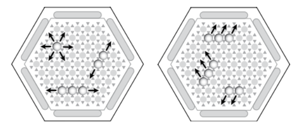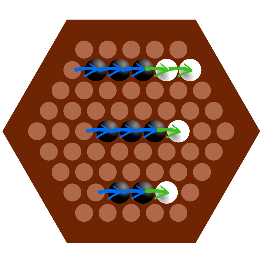 Es gibt noch eine Besonderheit beim Ausführen eines Zuges, nämlich das Schlagen eines anderen Spielers, das so genannte Sumito. Wenn ein Spieler beim ausführen eines Zuges in der Überzahl, also mehr Kugeln in eine Richtung bewegt, als Kugeln vom Gegner im Weg stehen, kann der Spieler die gegnerischen Kugeln schieben (Abb. 3). Ziel ist es als ersten sechs Kugeln des Gegner vom Feld zu schieben, um das Spiel zu gewinnen.