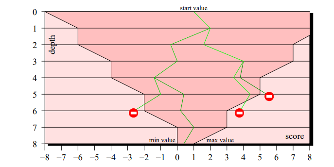 Wie zu sehen ist in Abb. 4, wird der Trichter immer enger, je tiefer gesucht wird, dadurch können viele Züge eliminiert werden. Der Verzweigungsgrad sinkt von ca. 60 bei naiver Suche auf 5 bis 8, somit ist die Suche erst jetzt praktikabel.[1]