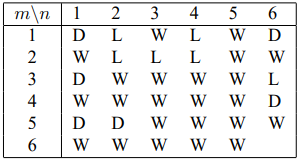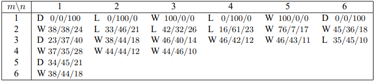 Tabelle 4[1:7] zeigt die Spielwerte verschiedener Kalah-Varianten sowie die Verteilung von Gewinn-, Verlust- und Remisstellungen im jeweiligen Spielgraphen. Auffällig ist, dass der Spielwert der Startstellung nicht immer mit der Mehrheit der Knotenwerte übereinstimmt, wie zum Beispiel bei Kalah(2,3).