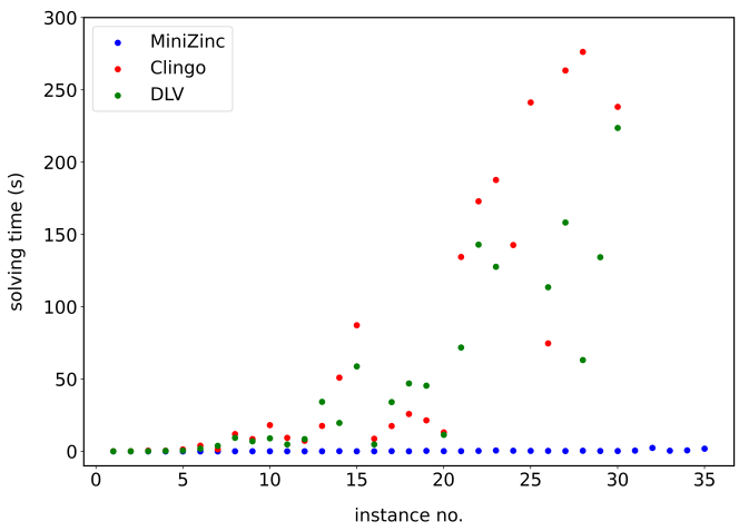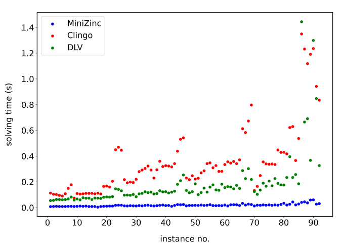 Um die Effizienz der beiden deklarativen Modellierungen zu vergleichen, führten Cian et al. Laufzeitmessungen auf einem System mit einer AMD Ryzen 7 4700U CPU und 16 GB RAM durch. Als Solver kamen dabei folgende Versionen zum Einsatz:
